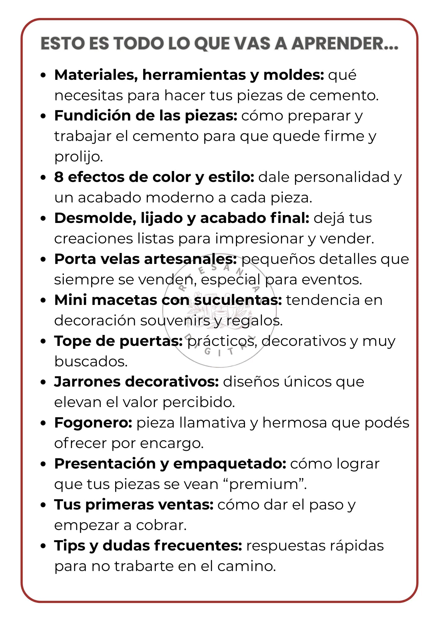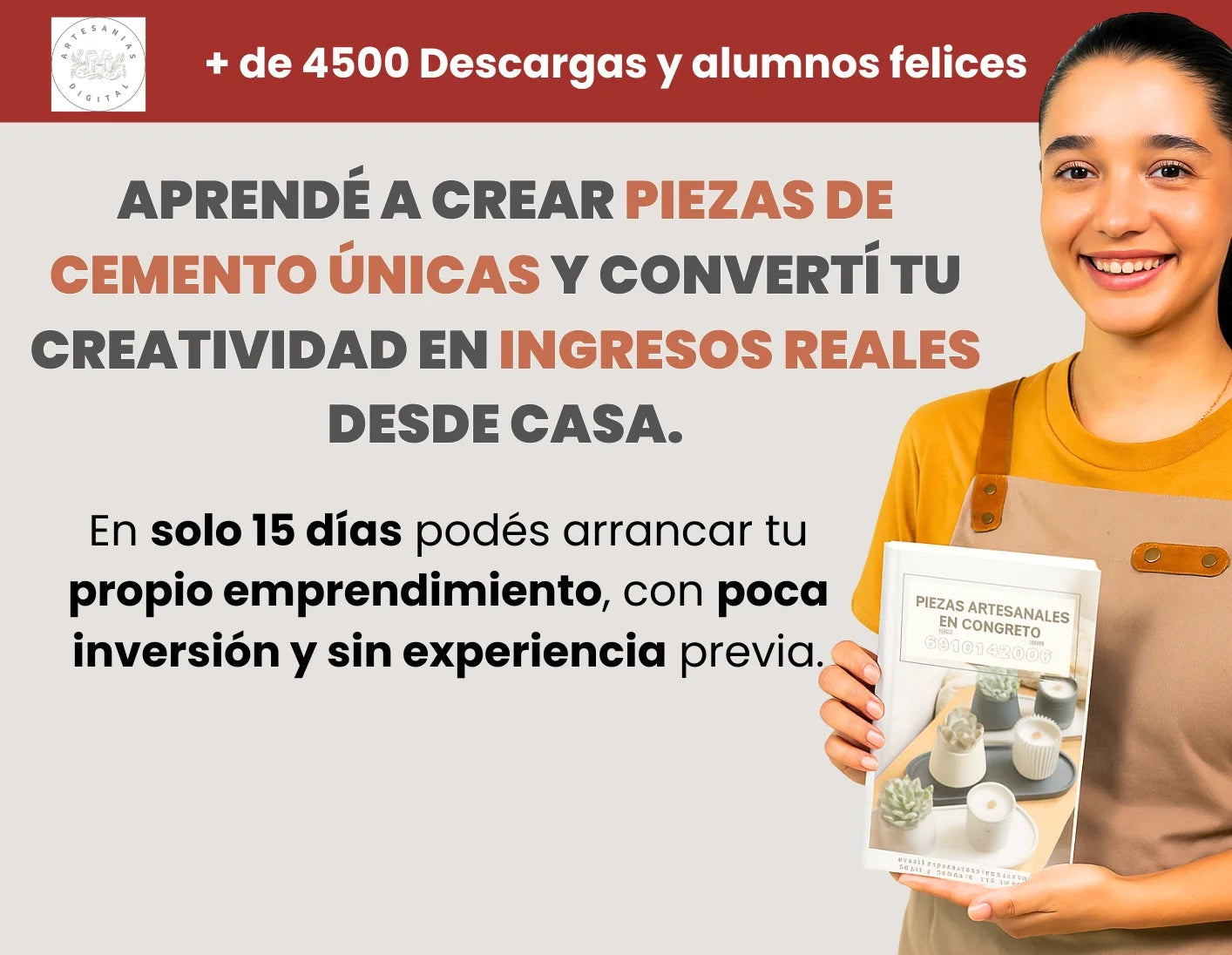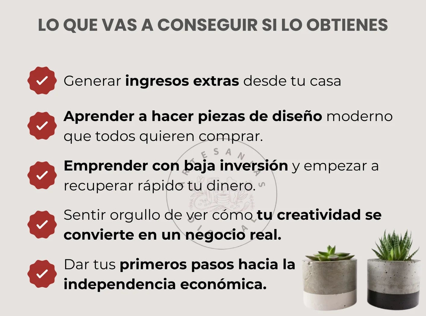 Las artesanías de cemento están de moda: son modernas, elegantes y útiles. Además, con los bonos extra aprendés a poner precios justos y a mostrar tus piezas de forma atractiva.